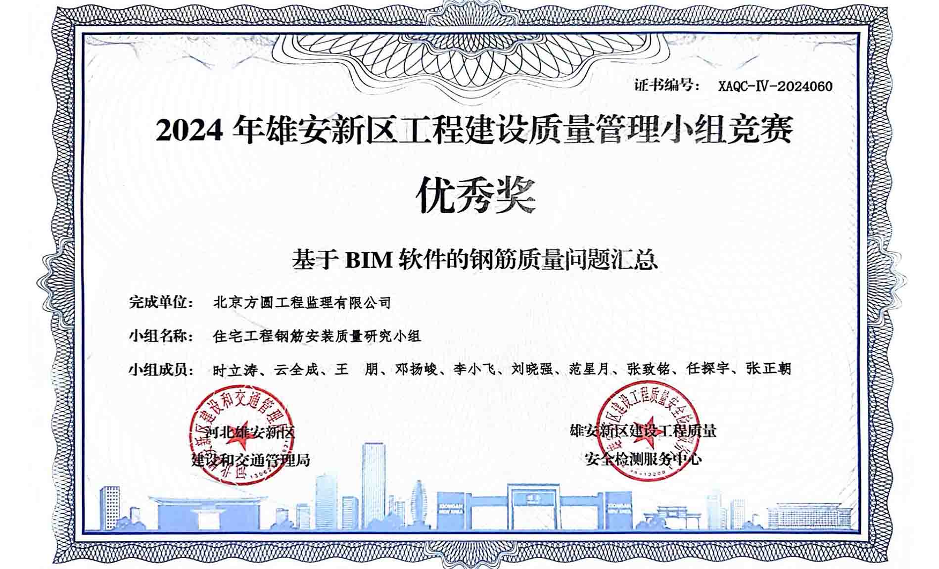 2024年12月,公司雄安新区中绿里项目参加了2024年雄安新区建设工程质量管理小组竞赛活动,由该项目监理部和公司BIM研究所主要人员组成的研究小组提交的《基于BIM软件的钢筋质量问题汇总与优化研究》成果,凭借其创新